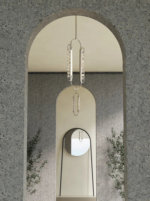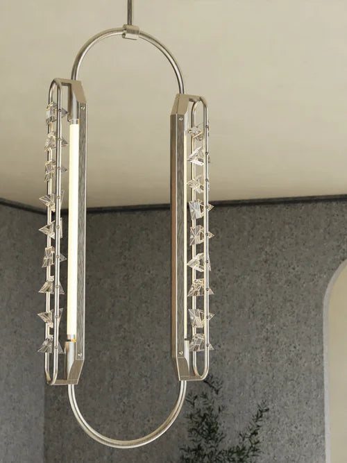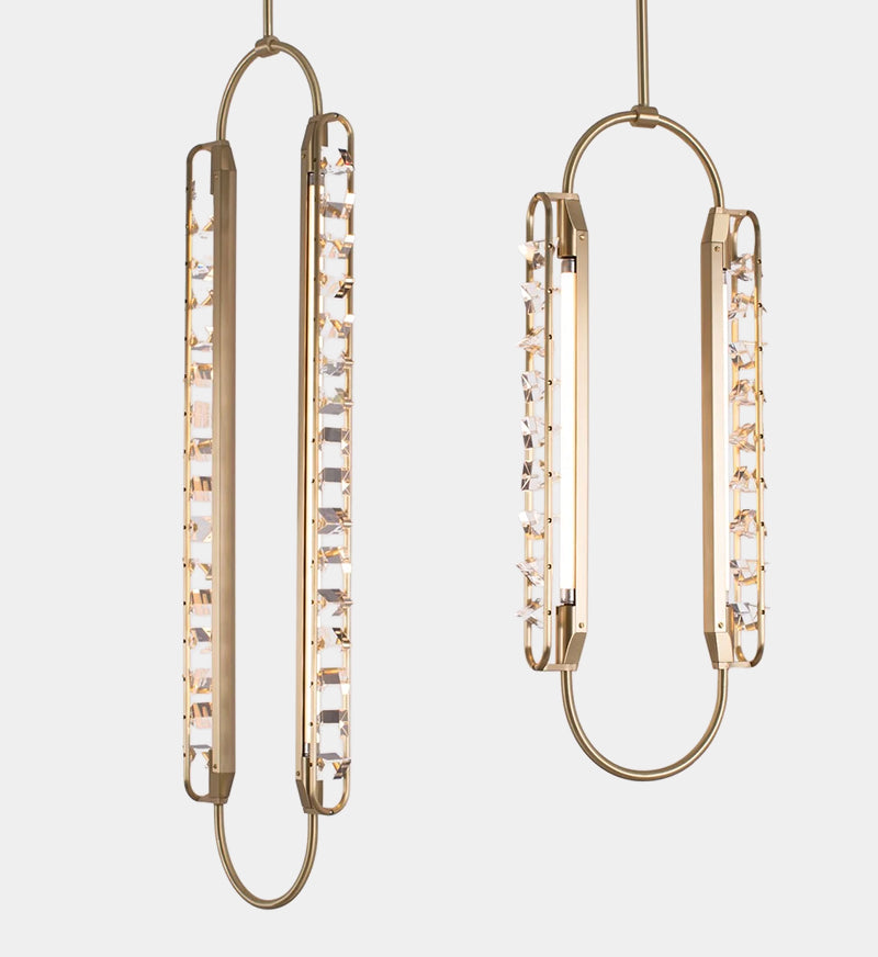 The Phaedra lighting collection is an exploration of form and light, where oval shapes intertwine to form a mesmerizing armature that cradles linear lights. At the heart of each luminaire, a captivating display of triangular prisms takes center stage, meticulously arranged along the length of the light. The design is inspired by the beauty of fresnel prisms but deconstructed into distinct elements, creating a contemporary and captivating aesthetic. Phaedra marries elegance with innovation. The interplay between the graceful ovals and the angular prisms adds a sense of dynamic tension to the fixtures, casting intricate patterns and captivating shadows when illuminated. The versatility of the collection allows it to encompass a range of fixtures, from sconces for subtle ambiance to larger fixtures that can command attention in grand dining rooms or other spacious settings.