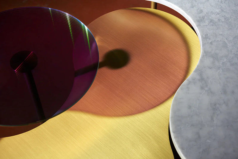 Mirror Polished Steel, Dichroic Glass (laminated safety glass), Matt Polished Brass, Brass (Matt Polished) with Protective Coating, Steel, Wood, Brass, Marble, Glass, Marble.