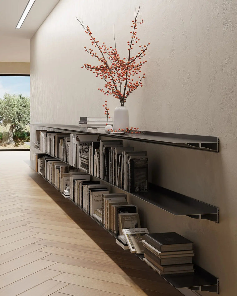 Oscar Tusquets and Lluís Clotet created the Cornisa in 1979. It is one of their most versatile, timeless and simple designs. The thin cornice lines? They are referential, and keep the structure slick. The Cornisa was inspired by the 1973 Hialina shelf. It is witty and postmodern (much like Clotet and Tusquets), floating in space while referencing a classic concept: a cornice. The two designers created the shelf in 1970. Its functionality and simplicity maintain its relevance across different settings on an individual and ergonomic level. Available in a narrow and wide style, the shelf can reach lengths of up to two and a half metres.