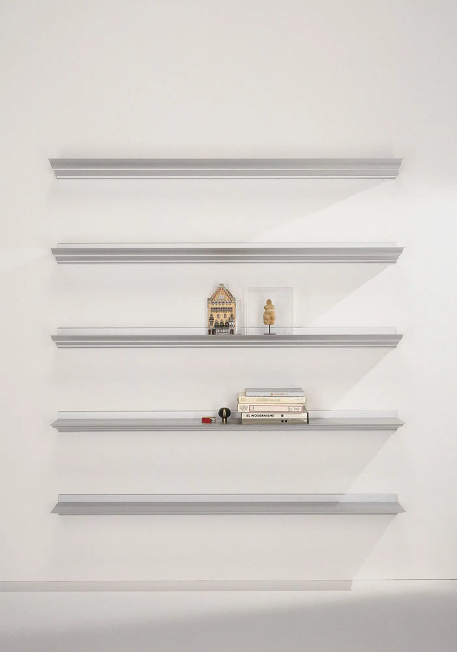 Shelves and vertical post supports in extruded aluminium from Hydro brushed and anodised silver. Fixing metalwork in zinc-coated iron. Feet in matte cast aluminium anodised silver. Black version available upon request.