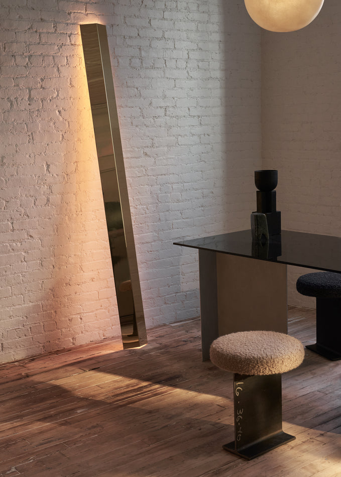 In his infinite experiments, Umberto Bellardi Ricci takes two simple geometries, the cube and the circle, and transforms them into the support – the throne – for the person who sits on it. Thus, the generous shapes of the seat contrast with the static, minimalist leg, in a structure that highlights the fine contrast between raw materials and refined textures and fabrics. The table that completes the family picks up the material contrast with a round marble top, supported by the same essential leg as the stools.