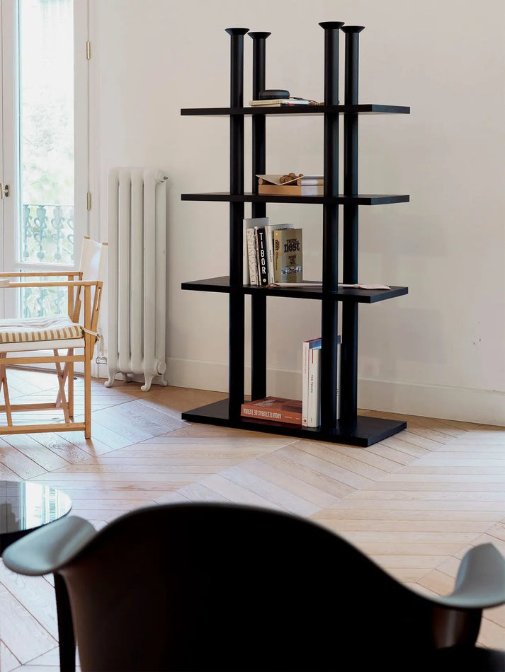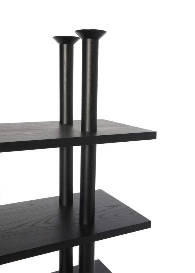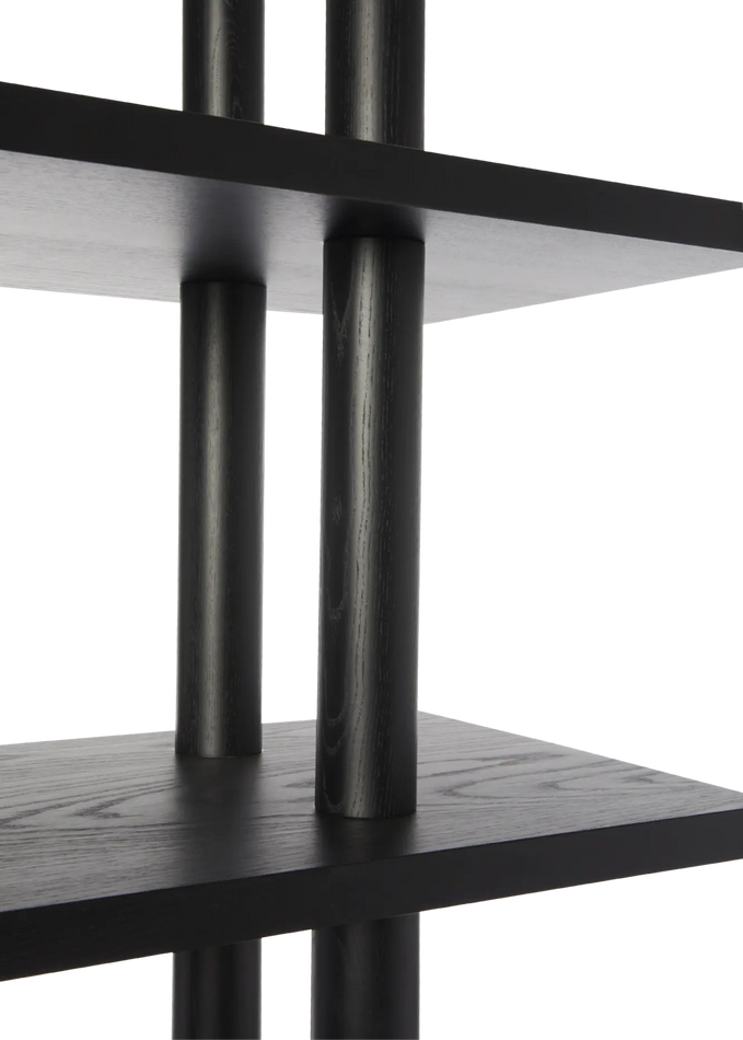 Shelving and base in solid ash wood and turned vertical supports in stained black wood.