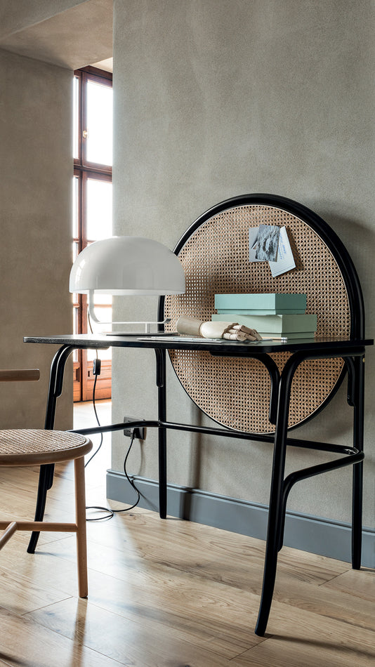 Allegory desk, a perfect handy stand for home office spaces and for the most intimate contract solutions, by the Italian-Danish duo GamFratesi, enriches the furniture proposal of Wiener GTV Design with elegance and simplicity. The wide disk in steam-bent solid beech contains a woven cane screen and characterize the desk with the brand’s iconic elements, by linking the countertop with the base’s bent element. The wide-mesh interweaving suggests that this element can be used for multiple applications, which makes it functional as well as aesthetic, enabling additional accessories and memos to be hung on the weave.