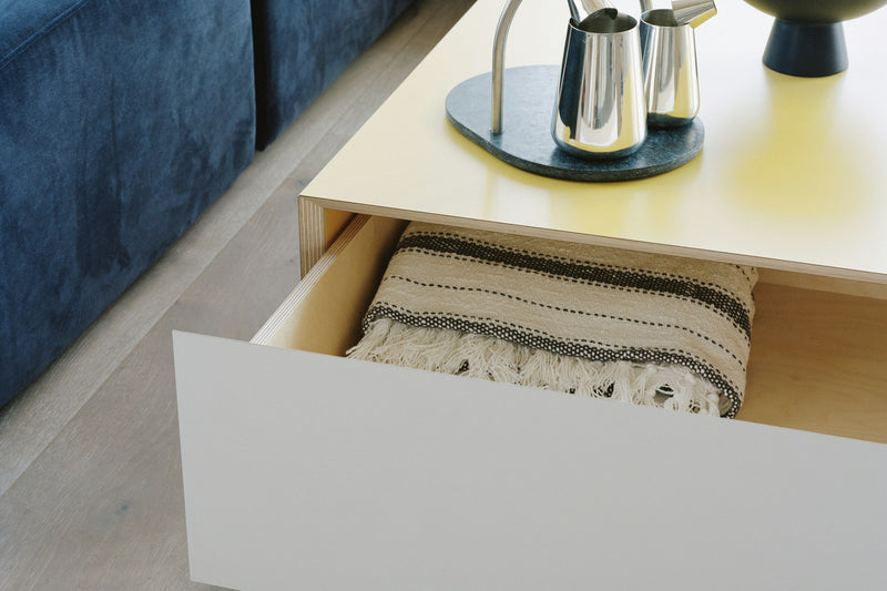 Birch plywood, high-pressure laminate, black stained oak (legs), soft-close drawer movement, steel ball bearing nylon castors (option).